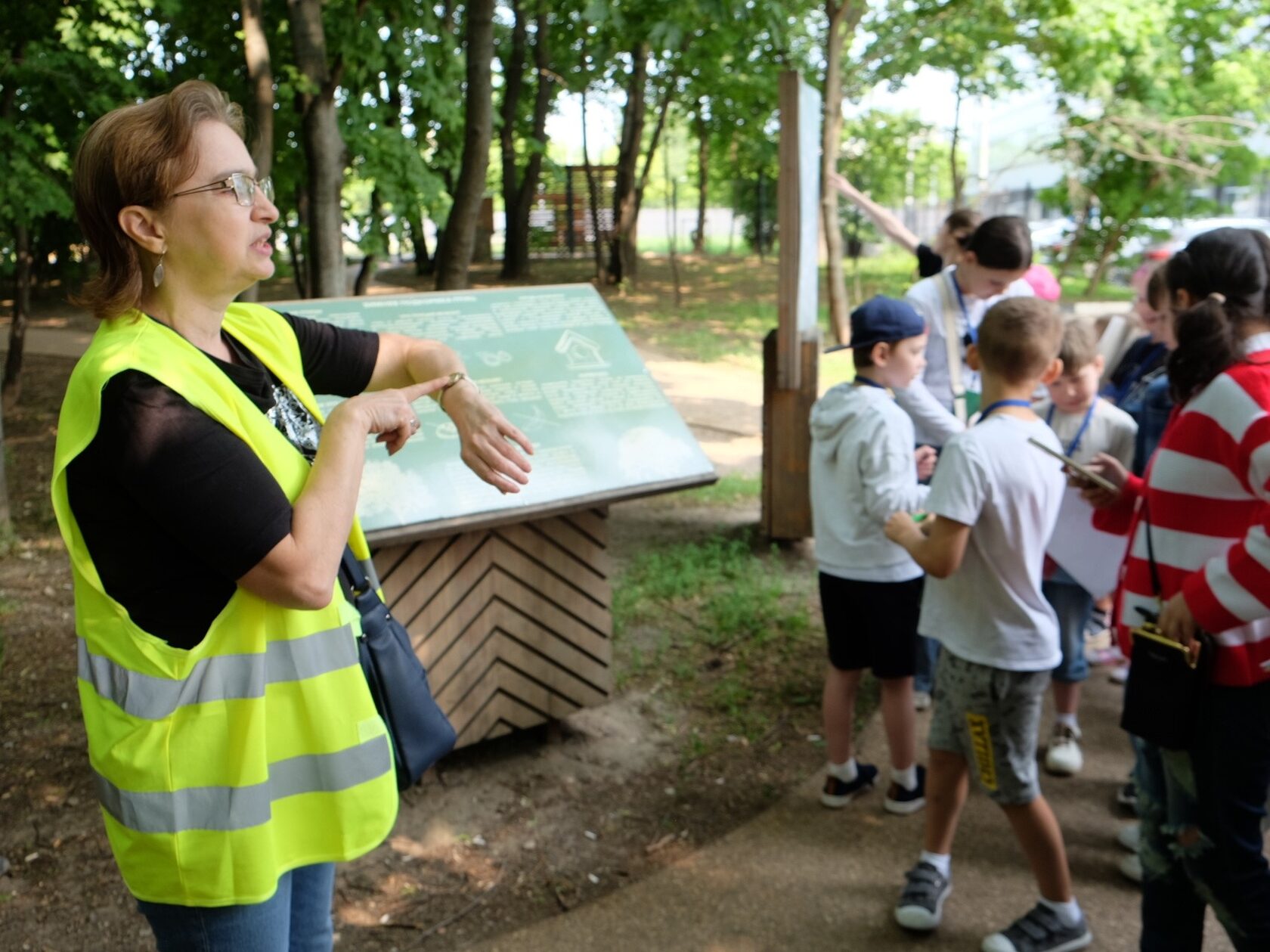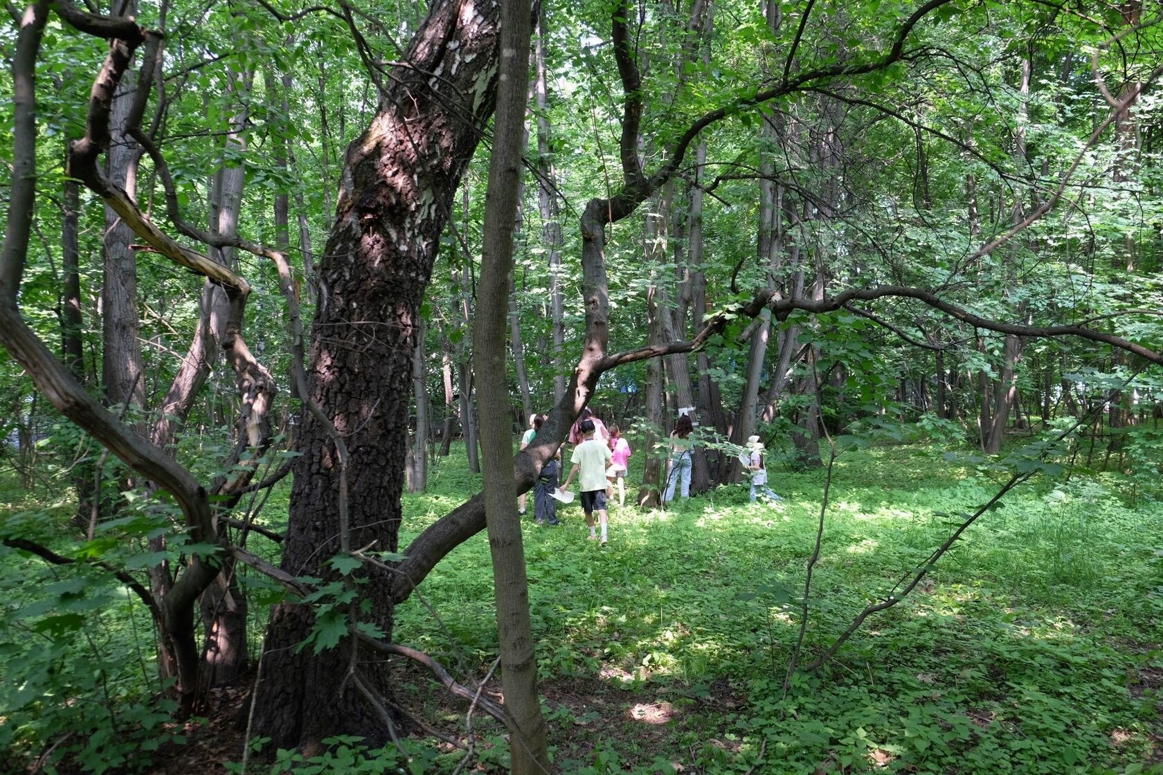Дети и родители разделились на команды и, получив от ведущих карту и задания, отправились в ближайший лес искать особенные места, узнавать о деревьях, структуре леса и его значении для человека.